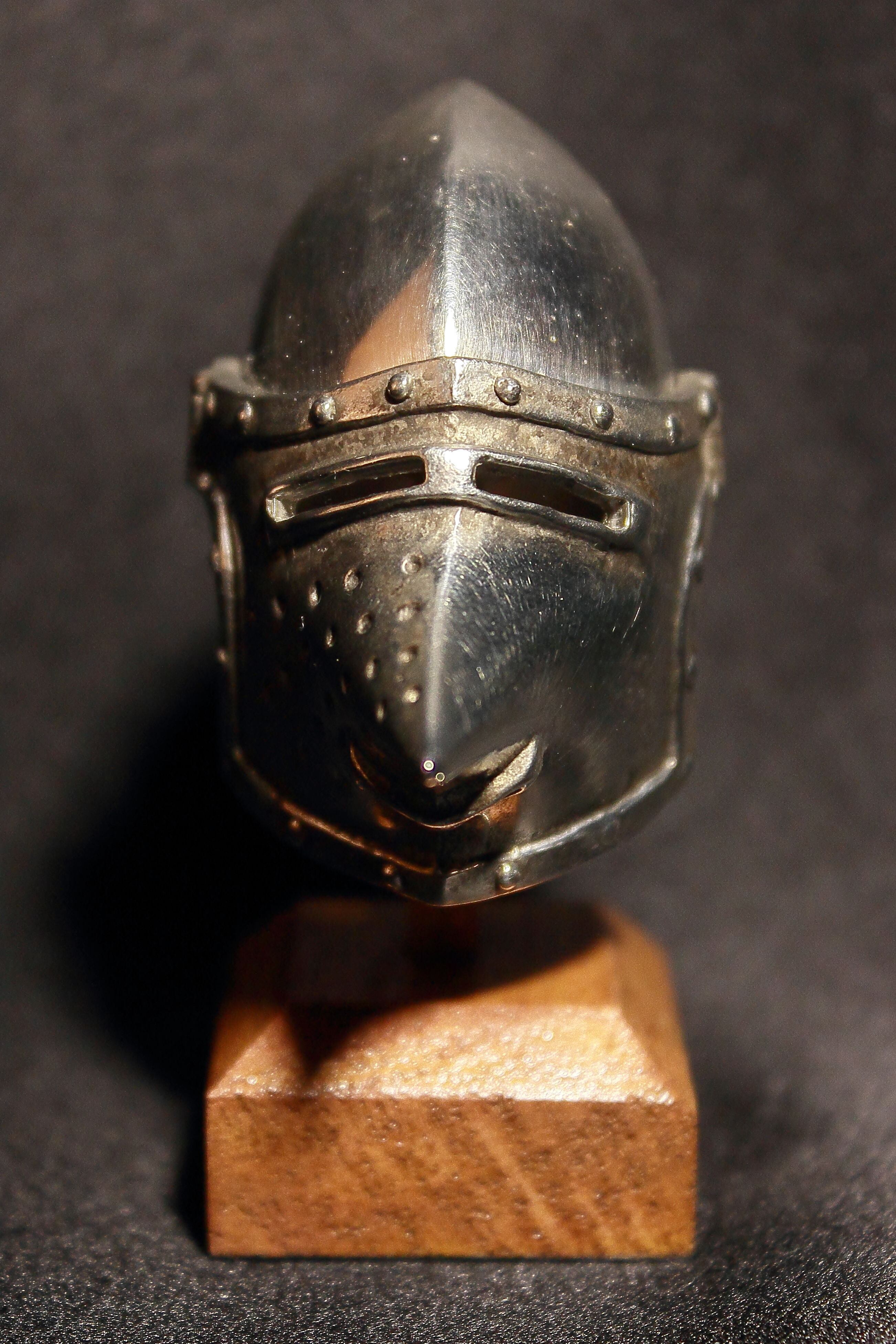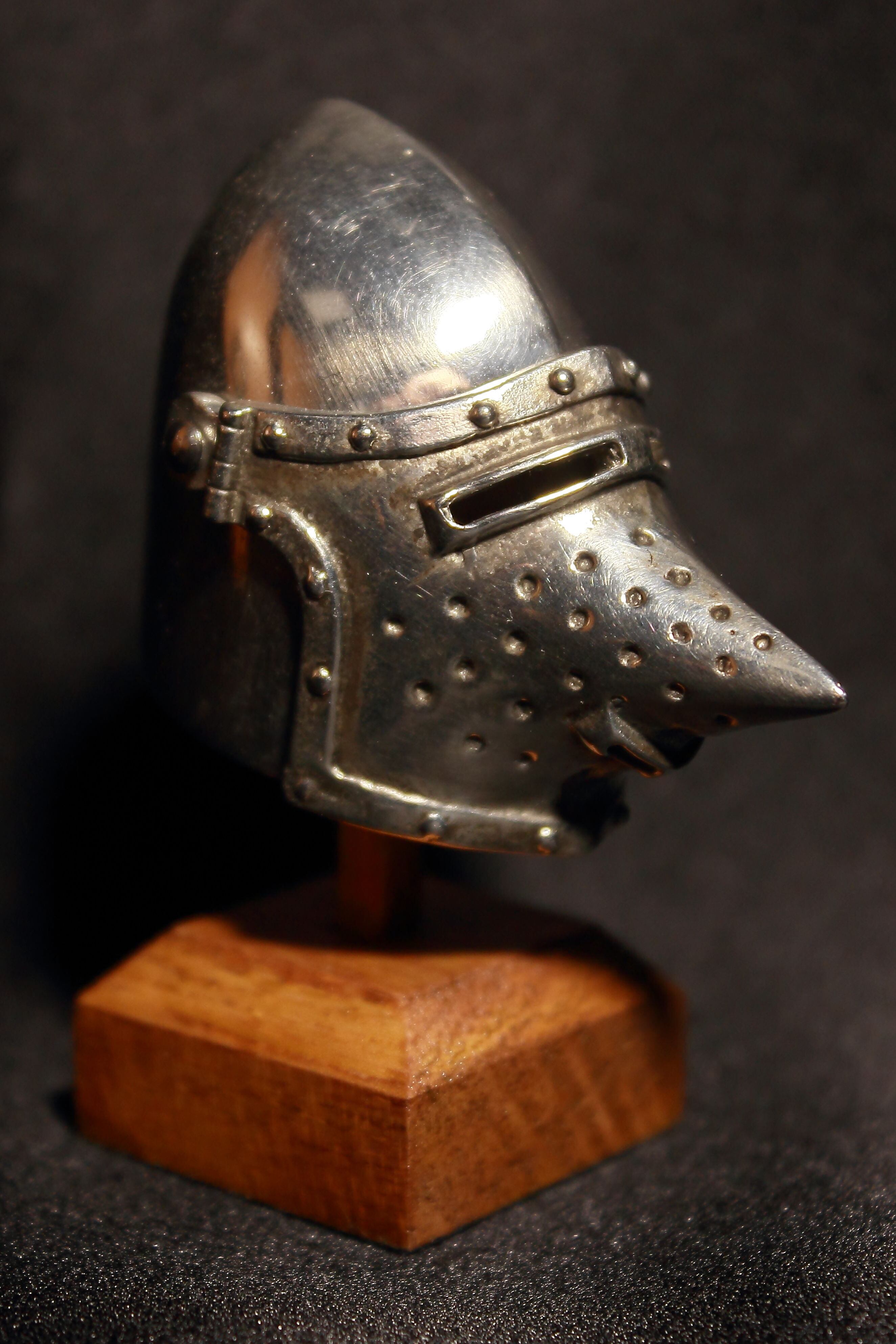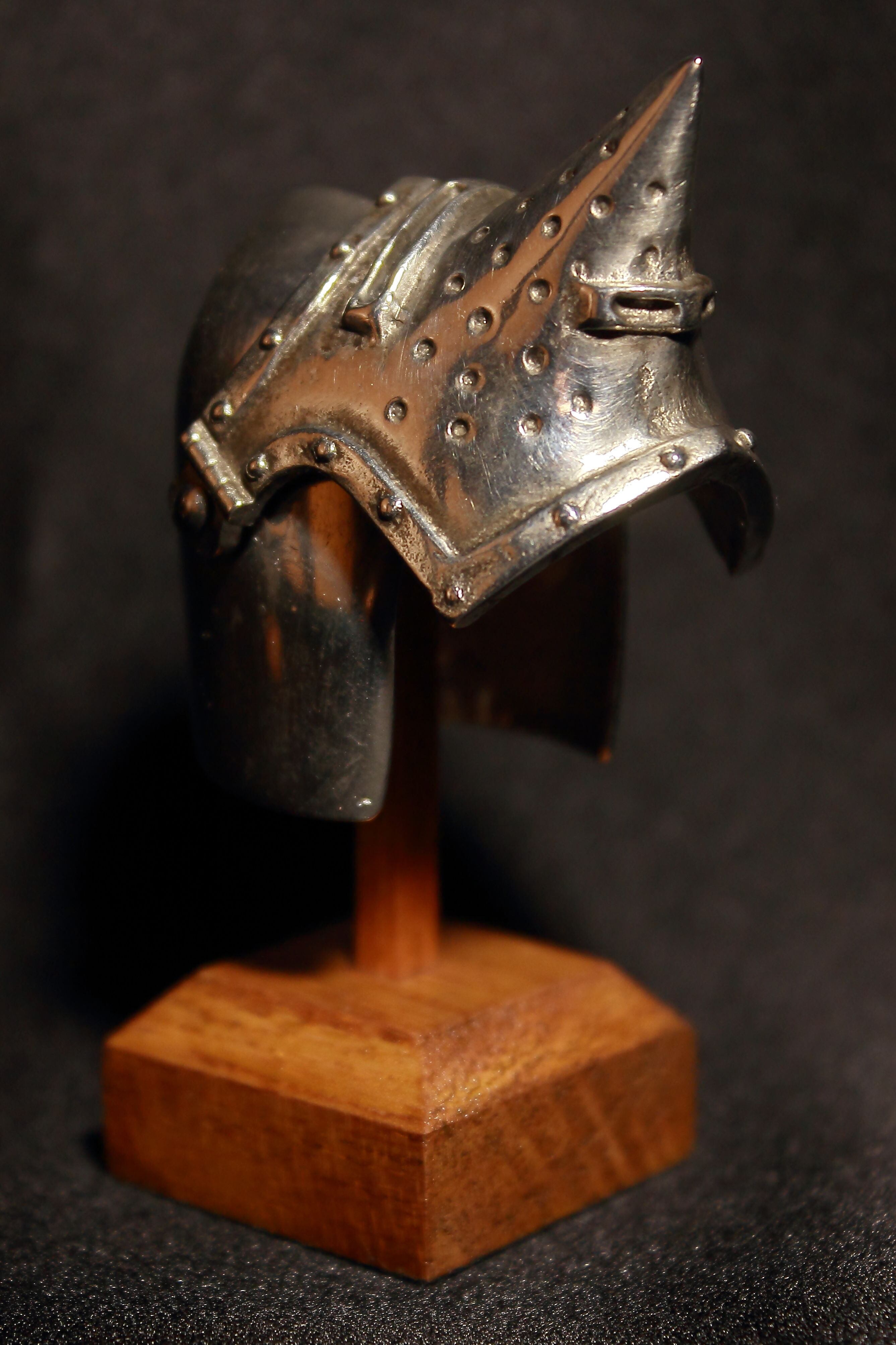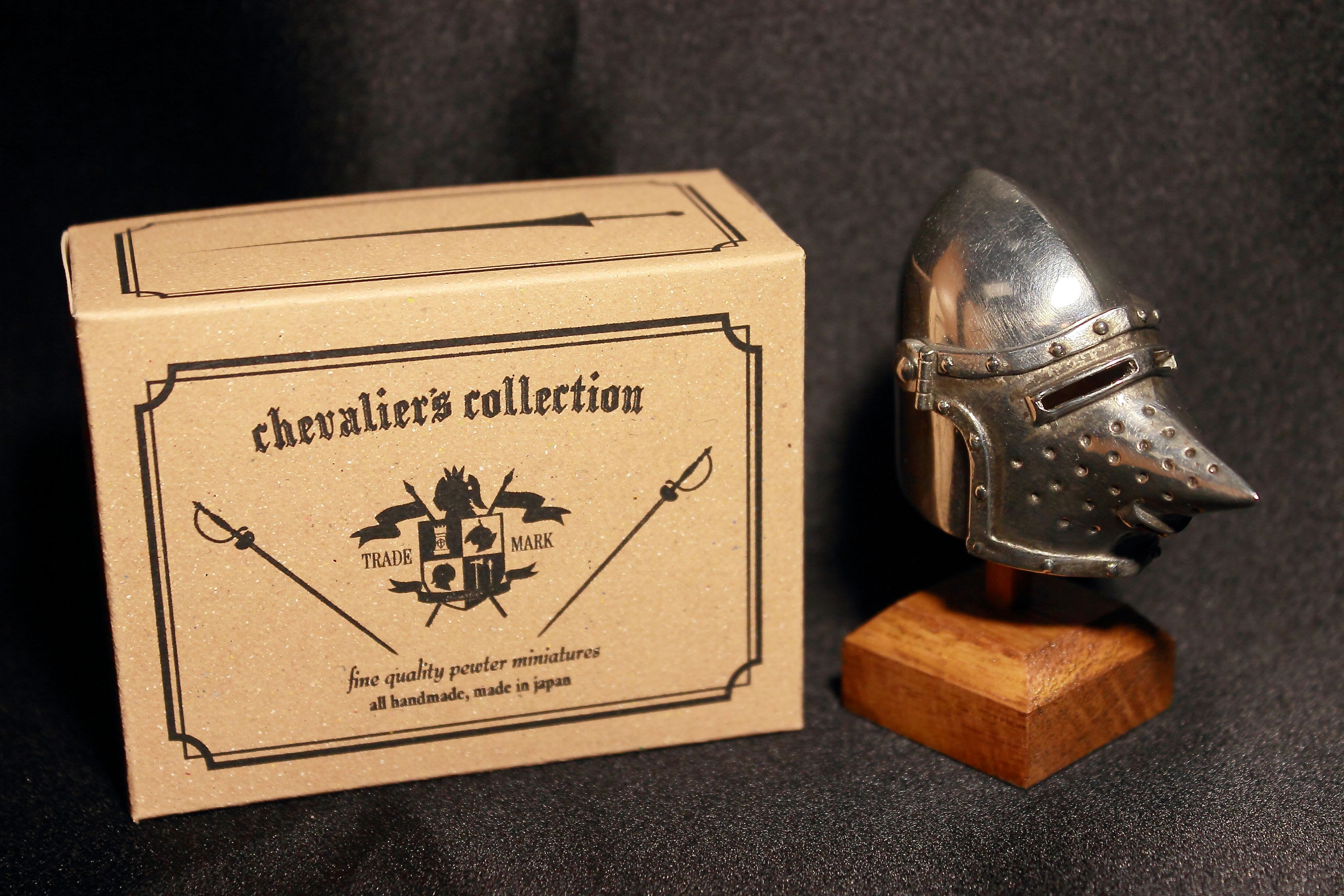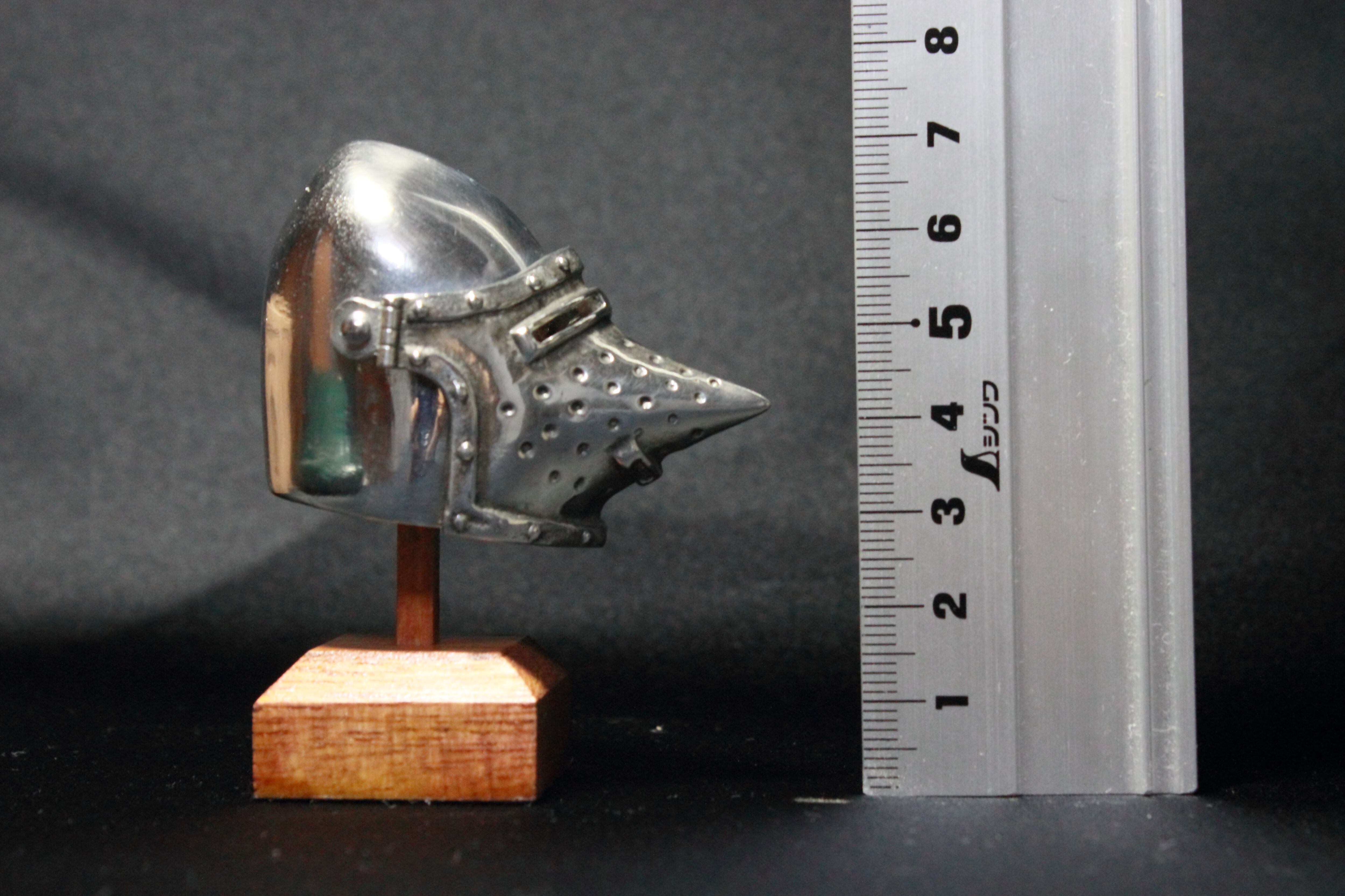 兜本体はピューターの鏡面仕上げ。マスク部分は別パーツになっており開閉できます。